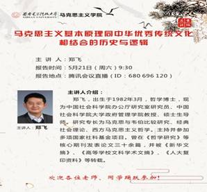 (通讯员 刘峰存)2022年5月21日上午,中国社会科学院办公厅研究室研究员、中国社会科学院大学政府管理学院教授、硕士生导师郑飞应邀为学院师生作了题为“马克思主义基本原理同中华优秀传统文化相结合的历史与逻辑”的专题报告。报告由学院经理李刚教授主持,学院师生以线上方式参与学习。